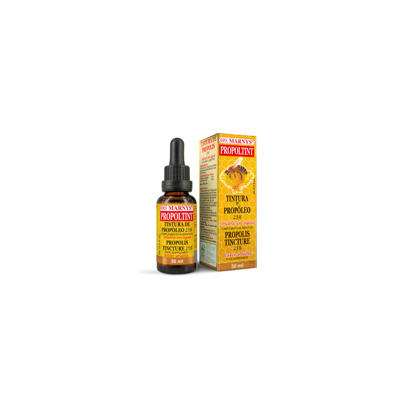 Propoltint de Marnys es una tintura de propóleo totalmente soluble en agua o cualquier otro líquido, con una concentración de 25% de propóleo, lo que lo convierte en uno de los mayores concentrados del mercado. A utilizar como complemento alimenticio.