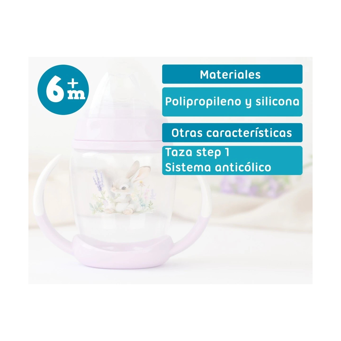 Especialmente ideada para bebés que aún no han desarrollado los dientes, su tetina STEP 1 en suave silicona de alta calidad ofrece la textura de los biberones, y flujo extra rápido a través de la succión, evitando derrames y permitiendo, junto a su sistema anticólico, pasar de forma progresiva y sencilla de la succión activa a la taza.