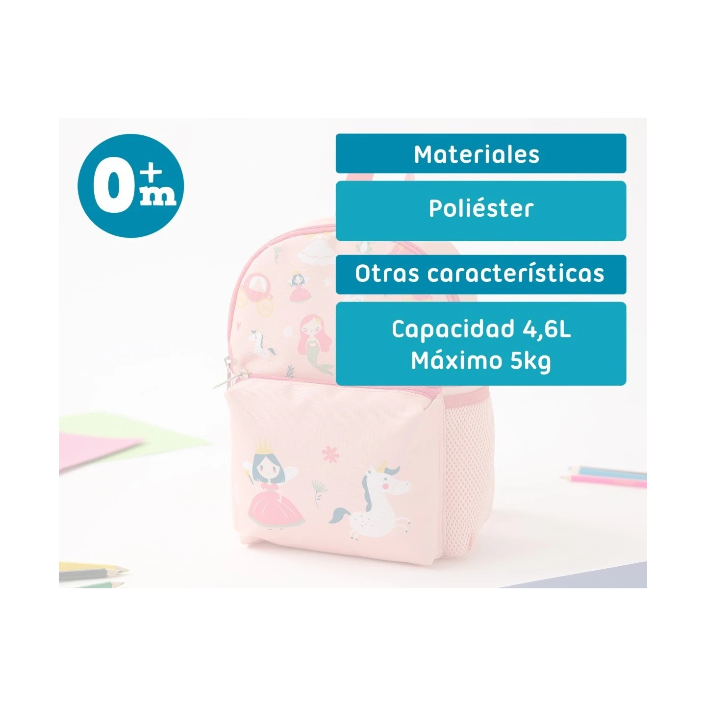 - Capacidad de 4,6L y soporta hasta 5 kg, fabricada en poliéster resistente para acompañar a tu peque en todas sus aventuras.