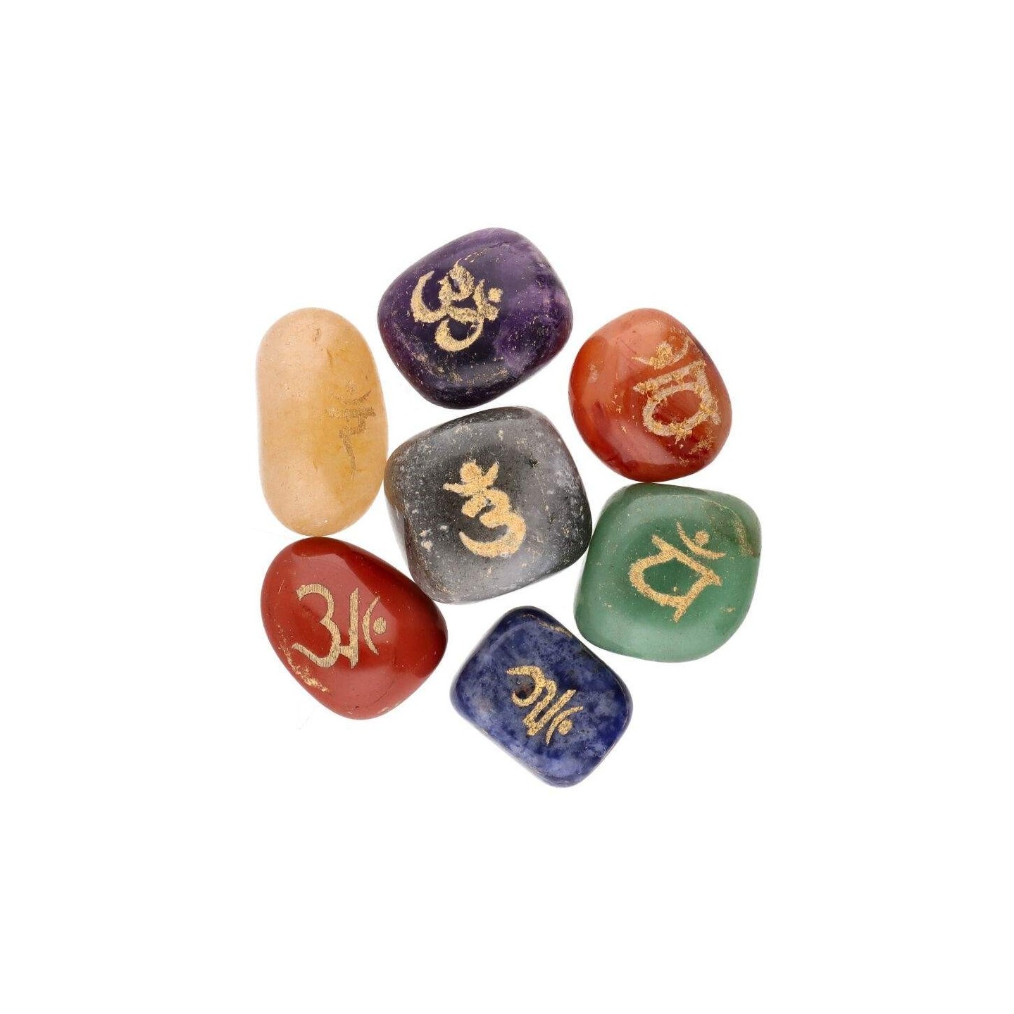 Simbología Grabada: Cada rodado lleva grabado el símbolo de su chakra correspondiente. Esta simbología actúa como un catalizador, intensificando la conexión con la energía de cada centro y facilitando la intención durante la meditación o la sanación.