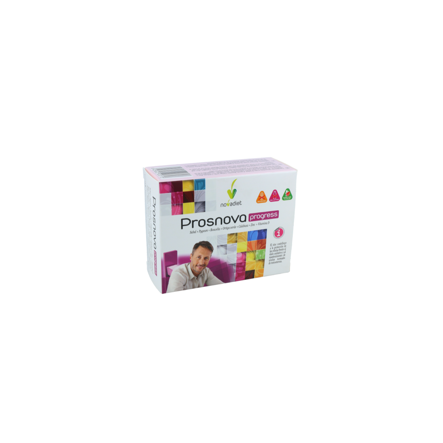 Saw palmetto, Ortiga común, Pygeum africanum, Boswellia serrata, Semillas de calabaza, Agente de carga (celulosa microcristalina), Sulfato de zinc, Extracto de tomate (DE, estandarizado al 5% de licopeno), Vitamina D (colecalciferol), Antiaglomerantes (estearato de magnesio, dióxido de silicio). Recubrimiento: agua e hidroximetilpropilcelulosa.