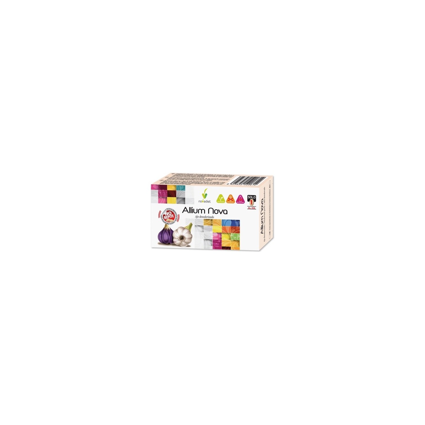 Allium Nova de Nova Diet es un complemento alimenticio elaborado a base de ajo Allium sativium L., con propiedades que ayudan al control de las cifras de tensión arterial y los niveles sanguíneos de lípidos y glucosa.