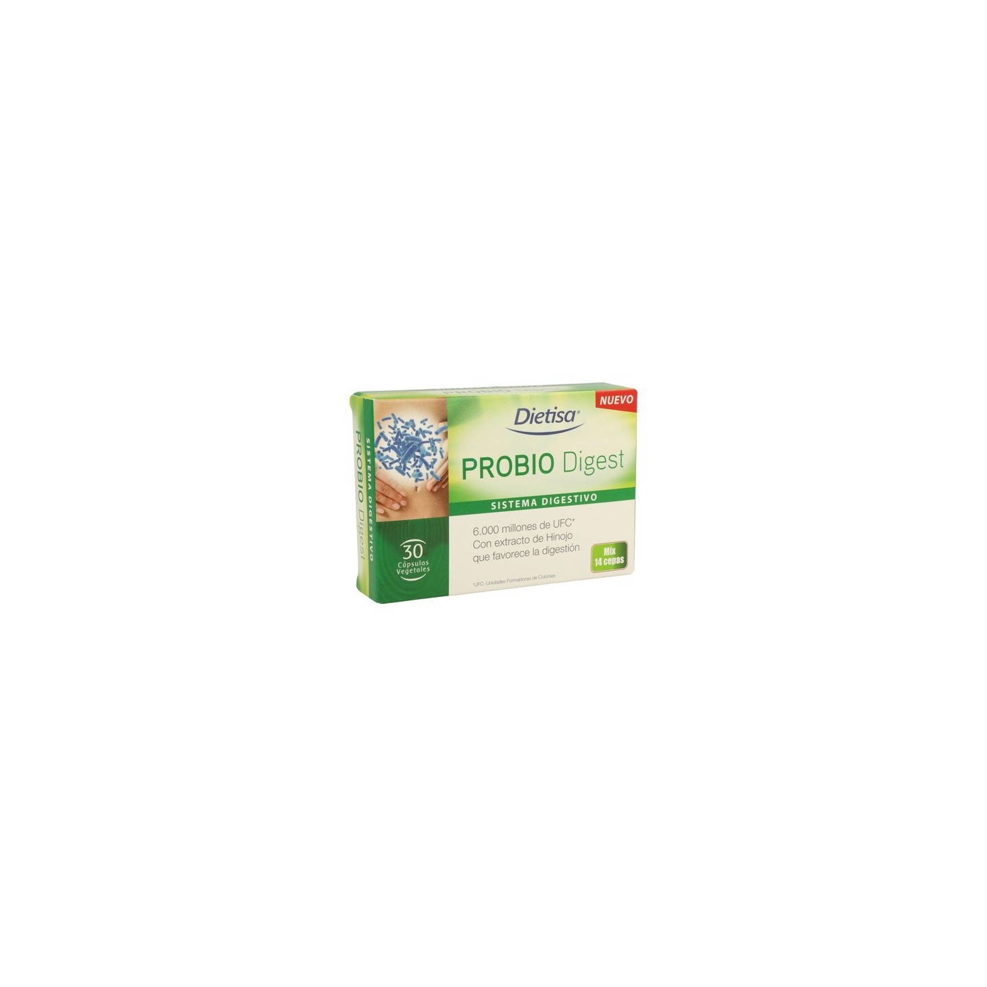 Extracto seco de hinojo 4:1, Fructooligosacaridos (FOS), Agente de carga: celulosa microcristalina, Proteasa, Aloe vera gel, Antiaglomerantes: dióxido de silicio y sales magnésicas de ácidos grasos, Clorhidrato de piridoxina y colecalciferol. Cápsula: Hidroxipropilmetilcelulosa, Colorante: dióxido de titanio Lactobacillus acidophilus, Lactobacillus brevis, Lactobacillus casei, Mezcla de 14 especies seleccionadas de microorganismos: Lactobacillus rahmnosus, Lactobacillus plantarum, Lactobacillus salivarius, Lactobacillus bulgaricus, Lactobacillus paracasei, Lactococcus lactis, Bifidobacterium bifidum, Bifidobacterium breve, Bifidobacterium longum, Bifidobacterium lactis y Streptococcus thermophilus.