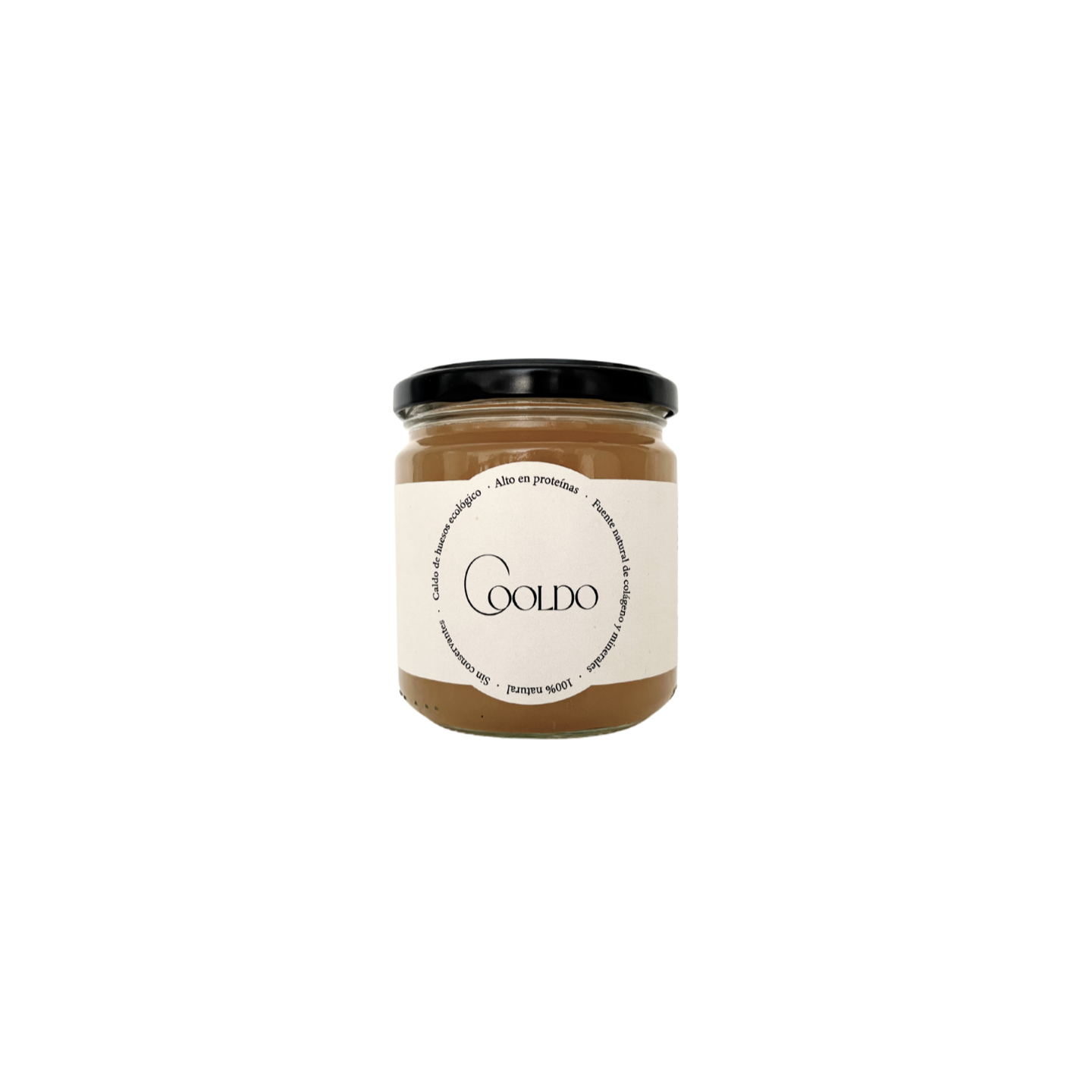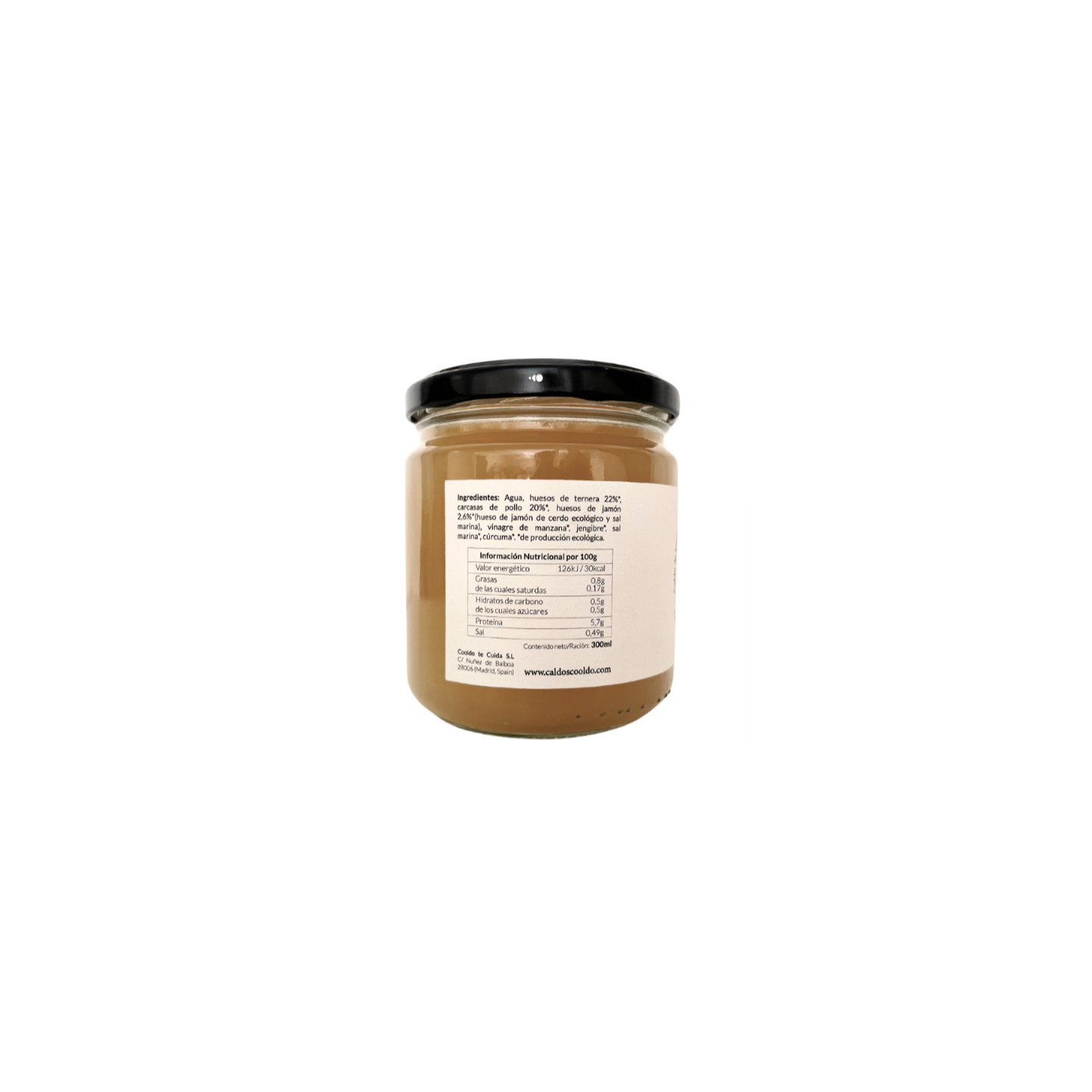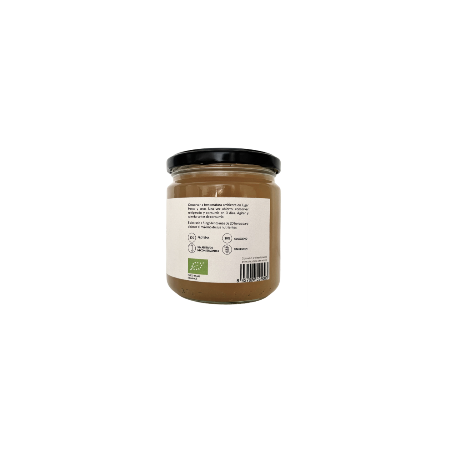 Agua, huesos de ternera 22%, carcasas de pollo 20%, huesos de jamón 2,6%* (hueso de jamón de cerdo ecológico y sal marina), vinagre de manzana*, jengibre* sal marina*, cúrcuma*. *Ingredientes de producción ecológica. El caldo de huesos es rico en colágeno y minerales. Además es fuente natural de otros aminoácidos como la prolina, la glicina o la glutamina. ¿y para qué sirven? Aquí os explicamos todas sus propiedades Prolina La prolina es un aminoácido no esencial que nuestro cuerpo puede sintetizar a partir del ácido glutámico. La prolina desempeña un papel esencial en la síntesis de proteínas, en particular, en la síntesis del colágeno. Entre sus funciones destacan: Fortalece las articulaciones y los tendones. Ayuda en el fortalecimiento de los músculos del corazón. Participa en la síntesis de colágeno. Mejora la textura de la piel. Ayuda en la regeneración de tejidos y mucosas. Ayuda en la inmunidad de nuestro organismo al relacionarse con el mantenimiento de algunas inmunoglobulinas. Glicina La glicina es un aminoácido no esencial, que, en ciertas situaciones como lesiones, enfermedades o inflamaciones articulares puede convertirse en esencial, ya que no somos capaces de producir las cantidades necesarias. Entre sus funciones destacan: Mantiene un correcto funcionamiento de la cicatrización. Indispensable para la síntesis de colágeno. Propicia la producción de la hormona del crecimiento. Ayuda a un correcto funcionamiento cerebral. Ayuda a regular los niveles de azúcar en sangre. Actúa como neurotransmisor inhibidor en el sistema nervioso central. Colágeno ¿qué es el colágeno y para qué sirve? Es la proteína más abundante en el cuerpo y se encuentra en nuestra piel, así como en los tejidos conectivos como las articulaciones y los tendones; mantiene unidos los huesos y los músculos, y mantiene el revestimiento del intestino. ¿por qué es tan importante tomar colágeno? El colágeno representa casi un tercio de nuestra masa total de proteína. También solía representar una parte relevante de nuestra dieta. Y en la actualidad no es así. Si a este hecho le sumamos que la síntesis de colágeno se ve reducida con la edad, es importantísimo asegurarnos suficiente materia prima para mantener su producción. Además, en mujeres, la bajada de estrógenos en la menopausia reduce todavía más la síntesis de colágeno. El caldo de huesos es una fuente natural de colágeno y contiene naturalmente los cofactores que ayudan a mantener el colágeno en el cuerpo. Gelatina La gelatina no es más que el colágeno cocinado. Una vez se enfría se solidifica y adquiere una textura de gel. Y es que si enfrías tu caldo y obtienes gelatina es una excelente señal de la presencia de colágeno. Caldos cooldo por supuesto es pura gelatina. Glutamina La glutamina es el aminoácido más abundante de nuestro cuerpo, ayuda a regenerar tejidos, tiene un papel importante en la salud digestiva y promueve una óptima función inmunitaria. La glutamina garantiza la integridad de la pared intestinal y nos ayuda a conservar nuestra masa muscular. Glicosaminoglicanos Son carbohidratos complejos que participan en muchos procesos biológicos. Son indispensables para mantener en buenas condiciones el tejido conjuntivo y el líquido sinovial, el lubricante que rodean nuestras articulaciones. Son glicosaminoglicanos el ácido hialurónico, la condroitina y la glucosamina. Minerales Los huesos de animales son una fuente muy rica en minerales como calcio, magnesio, cobre, hierro, manganeso, fósforo, potasio, sodio y zinc. Para extraer la máxima cantidad de minerales es clave añadir un chorrito de vinagre u otro ácido. En cooldo siempre nos proveemos de la materia prima de máxima calidad y por supuesto añadimos vinagre de manzana sin filtrar a nuestra receta de caldo de huesos para sacar el máximo de sus nutrientes.