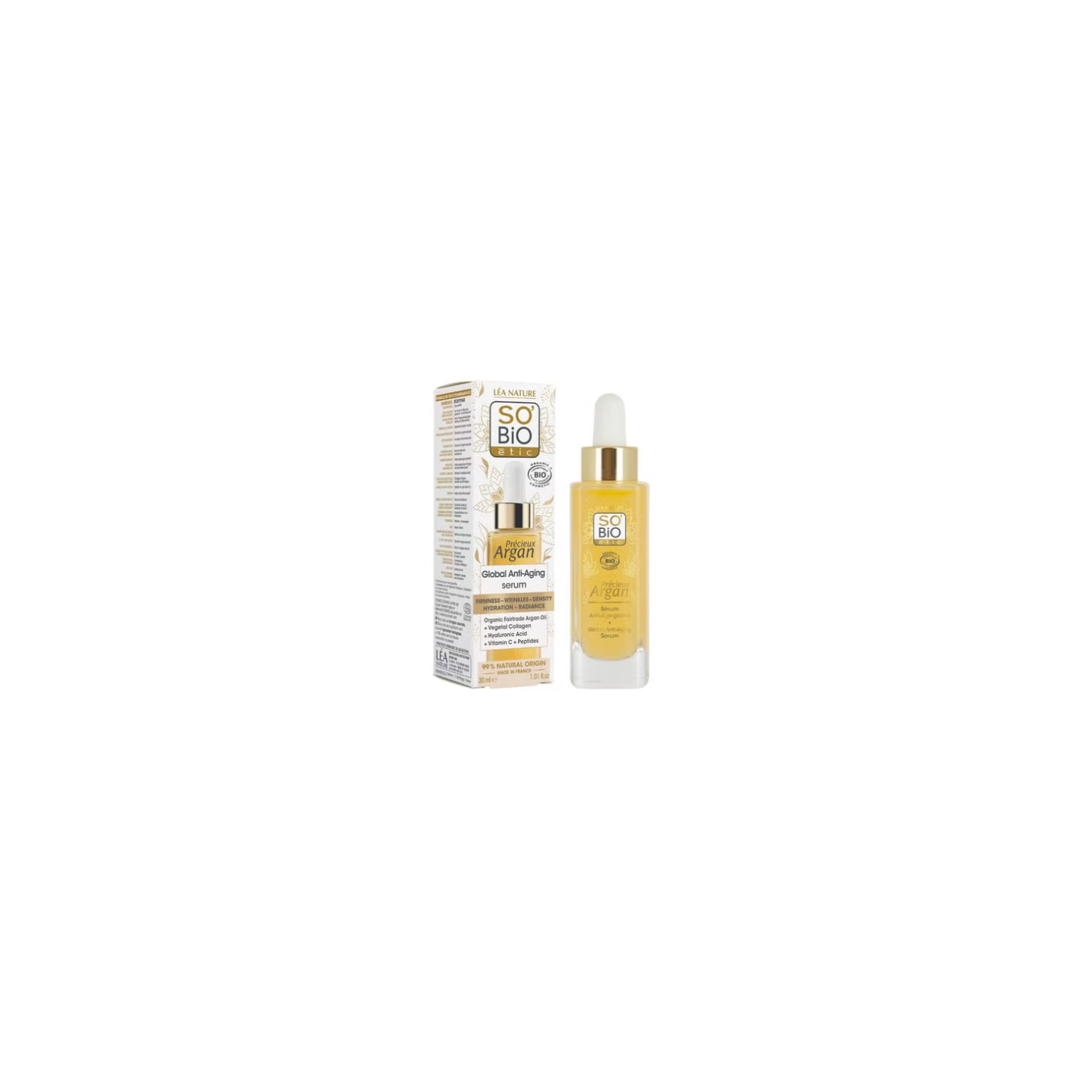 So'Bio Étic Sérum Facial Antiedad Global Argán 30ml es un elixir de belleza con una textura delicada. Este sérum está formulado con un complejo concentrado de ingredientes activos de gran eficacia, diseñado para ofrecer un tratamiento antiedad completo para la piel.